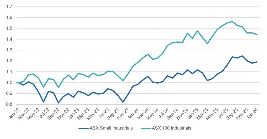 There was a lot of talk about the return of small caps in 2025. And yes, Australian small caps did perform well in 2025, up 25% for the year, outperforming large caps by around 16%i. On the surface it might appear that because of this period of outperformance, small caps are set for a period of more muted performance, or even a pull back. While of course this is possible, we think that if investors focus on small cap opportunities in industrial stocks, small caps remain well placed for superior growth in 2026 relative to large caps.