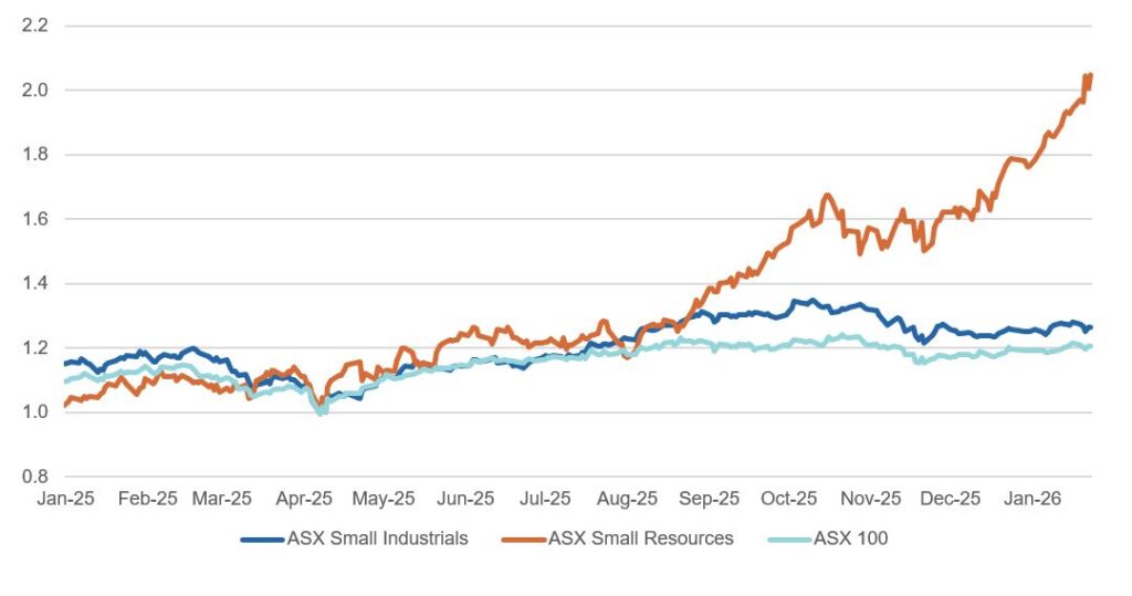 While small caps did well overall in 2025, this growth was not uniform. Most of the small cap outperformance was driven by small resources as you can see in the chart below, particularly gold stocks. Whereas small industrials, which are typically higher quality and where most of our holdings lie, only just beat large industrials for the year.