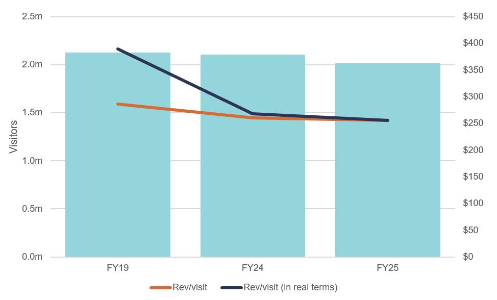 Casino operator SkyCity Entertainment has had a torrid few years with a recession in New Zealand, regulatory pressure on both sides of the Tasman and a stretched balance sheet (leading to a deeply discounted equity raise) resulting in material share price underperformance. While the introduction of mandatory carded play is a headwind, visitation has actually remained relatively stable at the core Auckland casino as shown below. Unfortunately, the weak NZ economy has resulted in spend per visit falling 35% in real terms since FY19.
